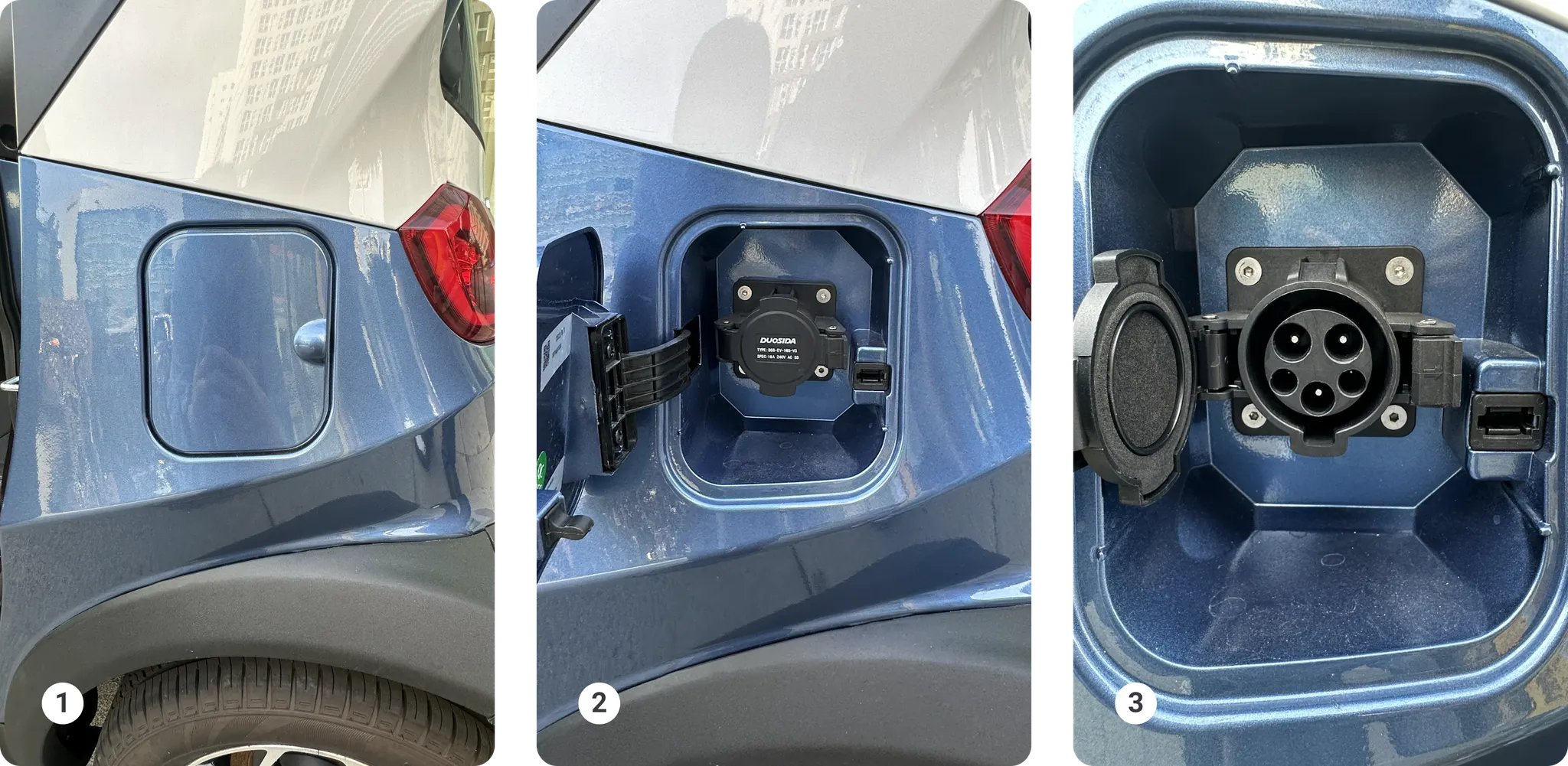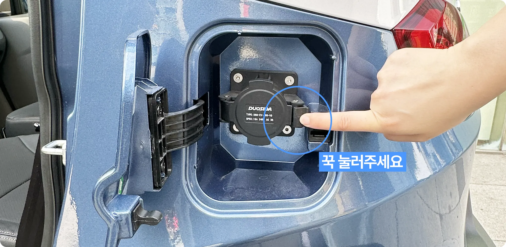 운전석 방향에 위치해 있는 충전구를 손으로 열어 주세요, 충전은 모두타유 충전기로만 이용해주세요.
