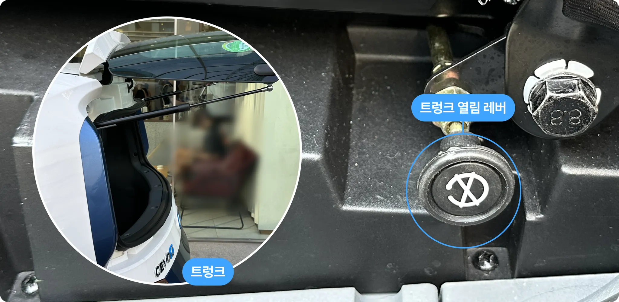 트렁크 열림 레버는 운전석 아래에 위치해있어요. 레버를 당겨주시면, 뒤에서 트렁크가 열려요.