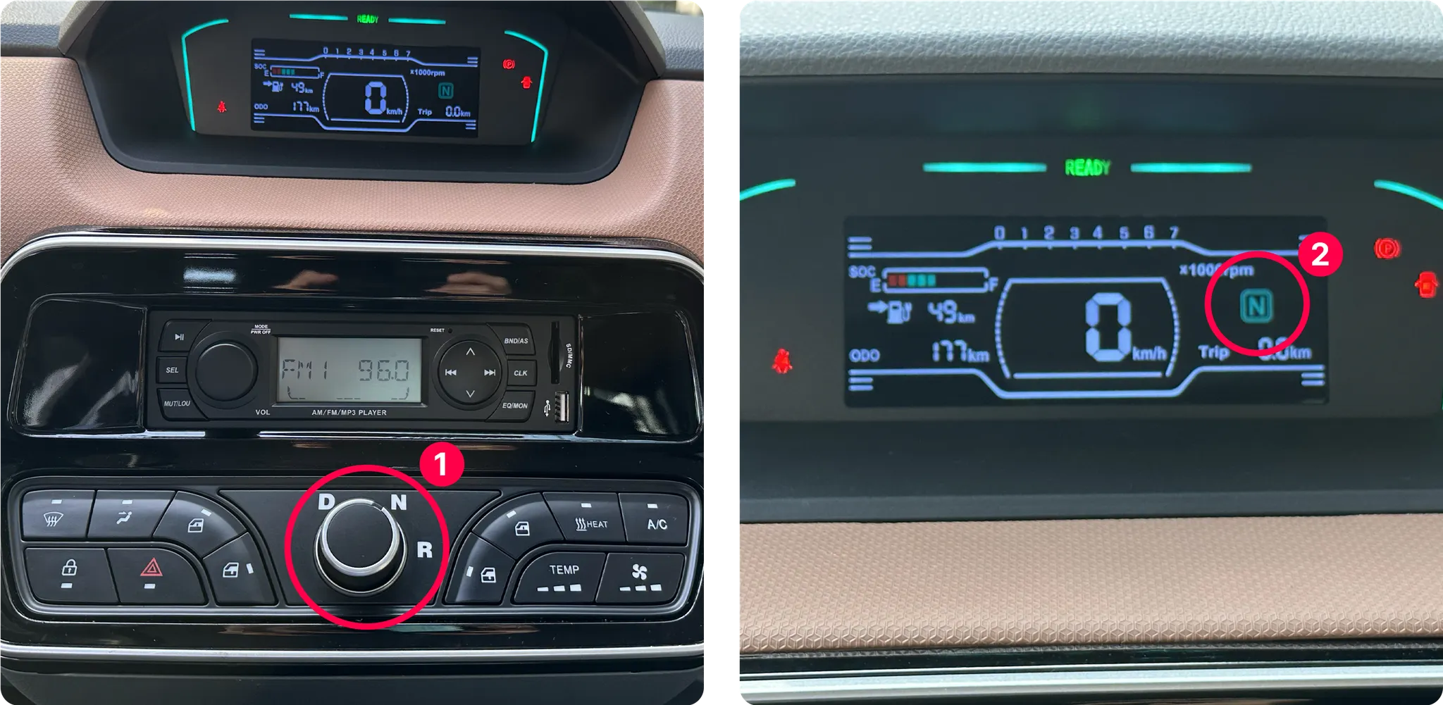 브레이크를 반드시 밟고 다이얼을 돌려주세요.